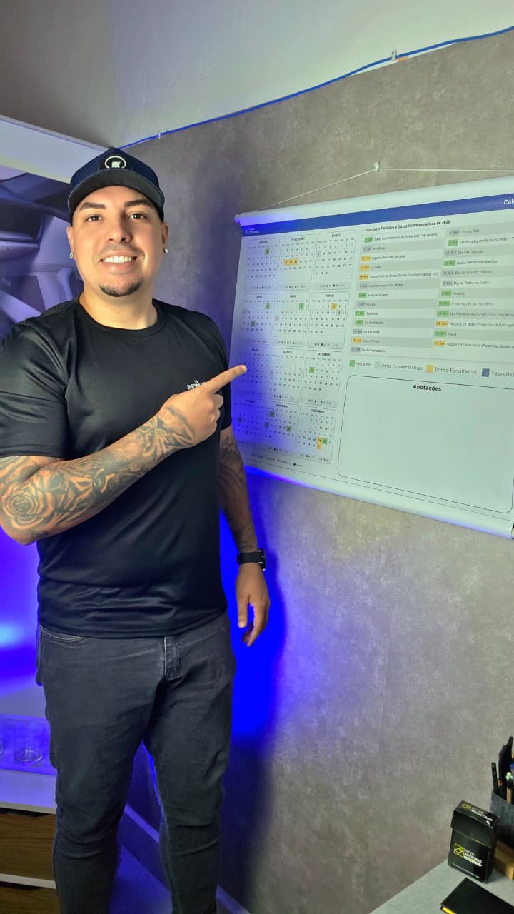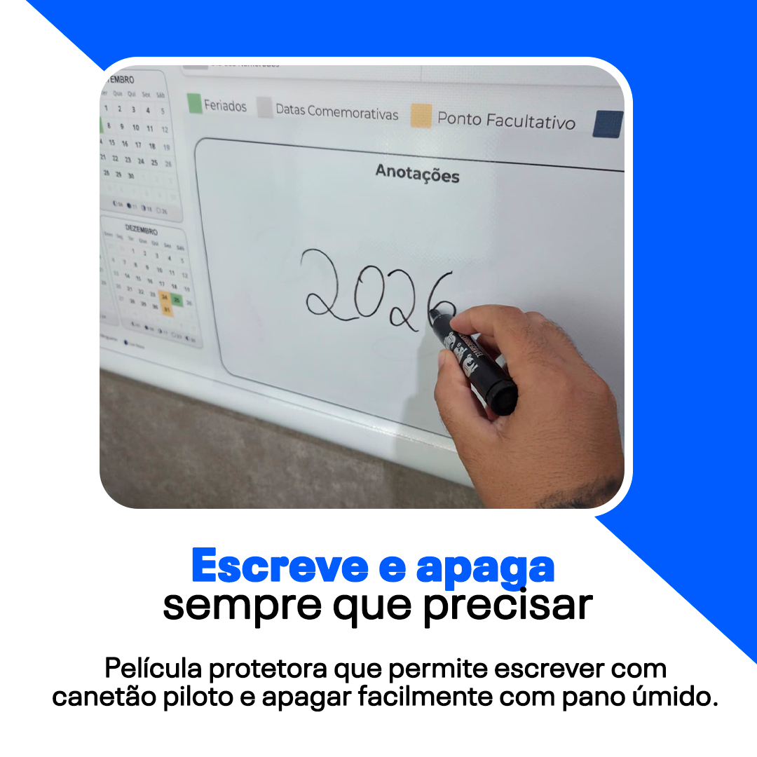 Produzido em lona premium, ele permite anotar datas, apagar e atualizar quantas vezes quiser, mantendo tudo à vista de forma simples e organizada.